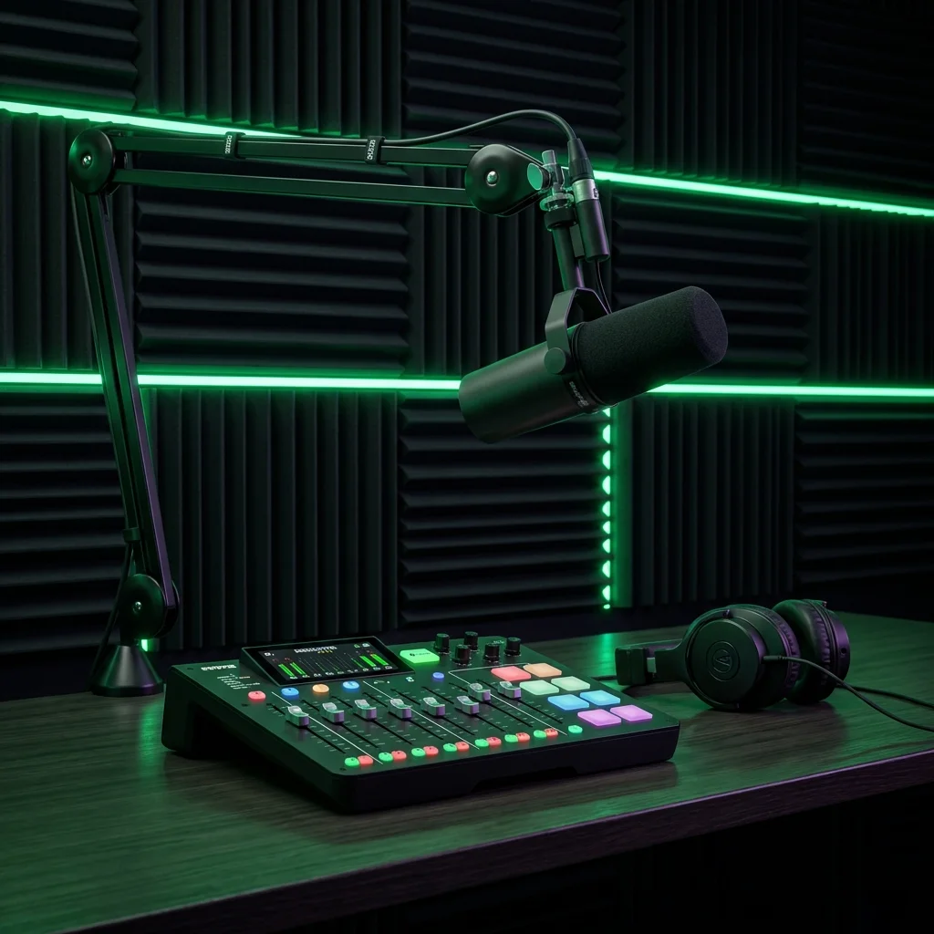 The exact workstation we use for high-velocity broadcast. Shure SM7B meets the Rødecaster Pro II.