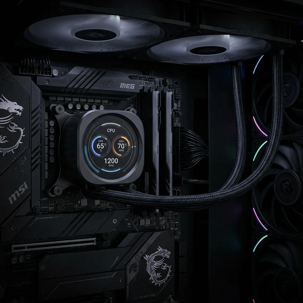Elite AIO liquid cooler with a built-in IPS display for real-time monitoring.
