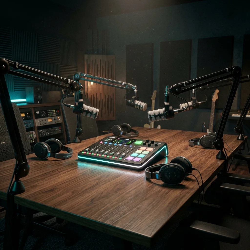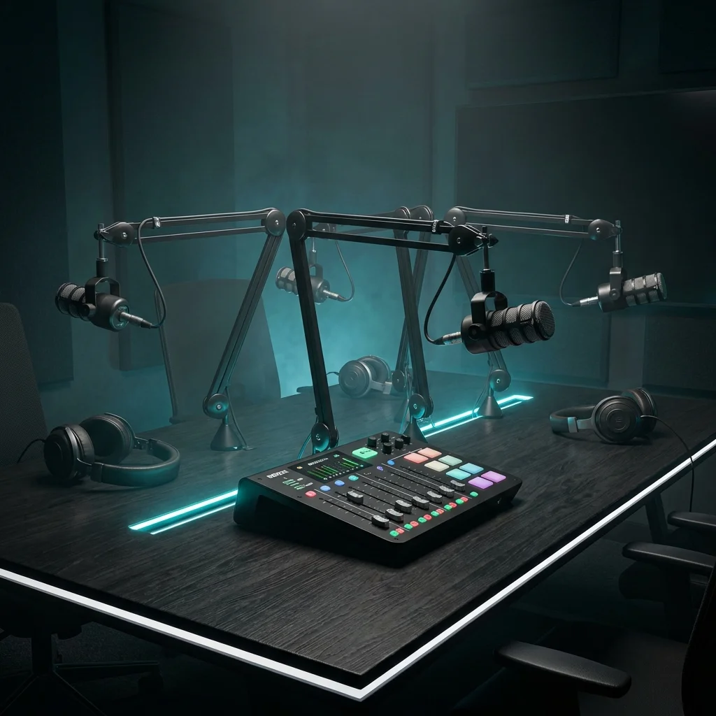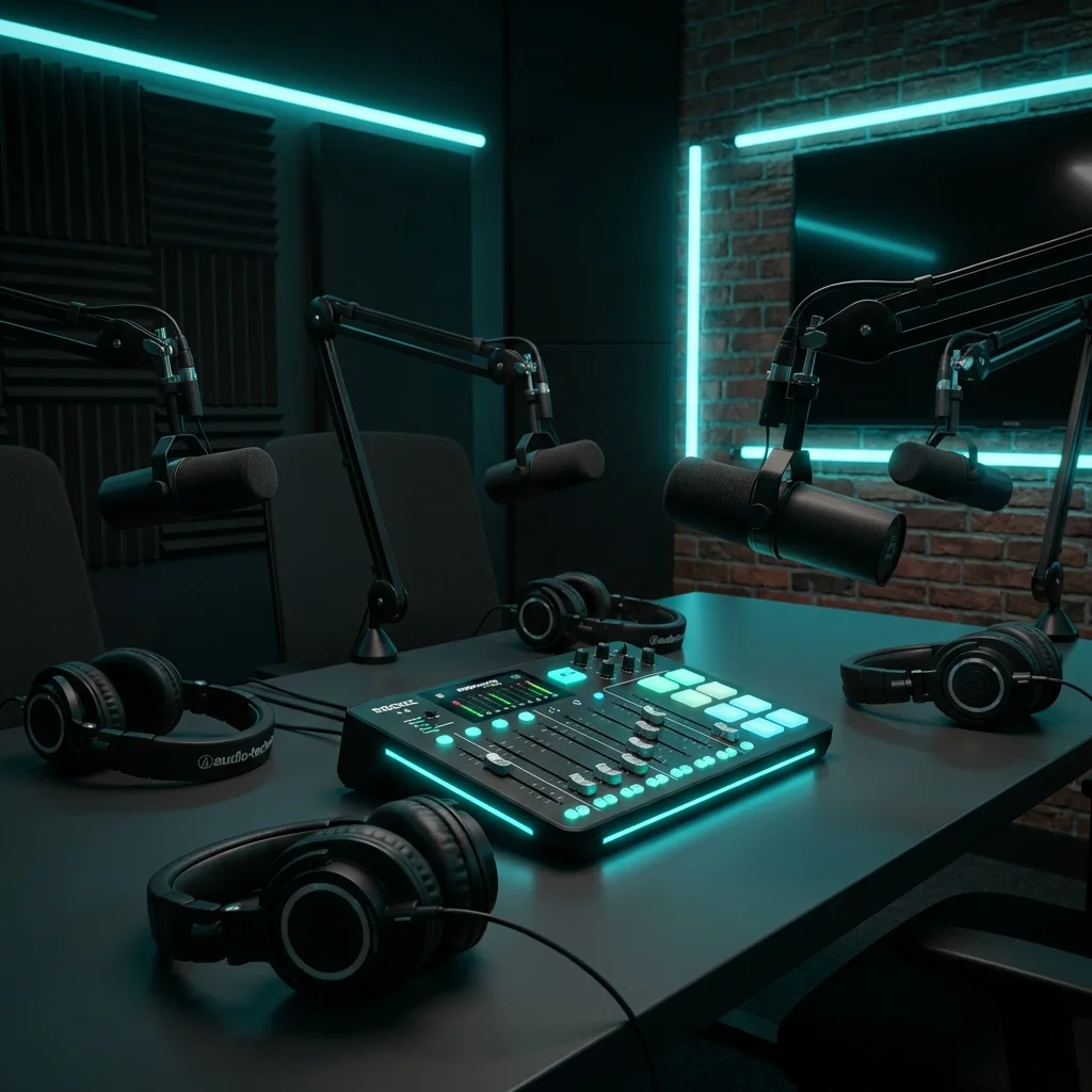 Professional multi-guest podcasting kit for high-fidelity broadcast and recording.